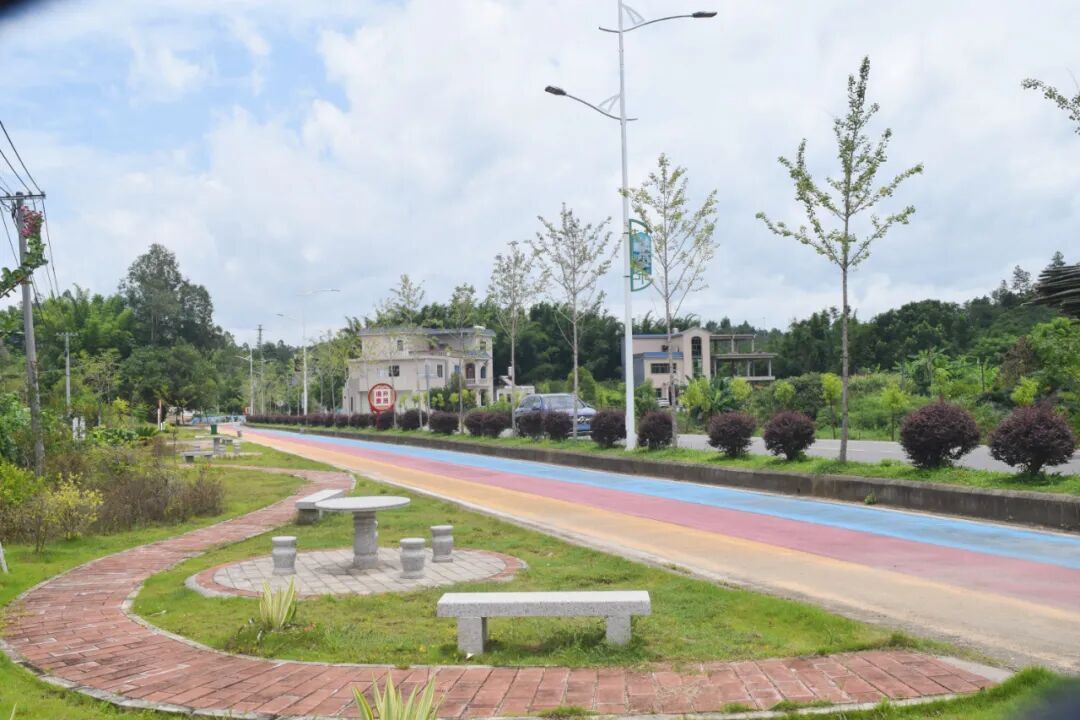 金光村法治公园紧邻彩虹骑行道,园内休息区、绿植与法律知识宣传栏系统呈现法治文化。珠三角游客李先生携家人骑行至此停留:“来这里感受乡村风光,还能学法律知识,孩子提问不断,收获满满。”九和村禁毒公园通过禁毒知识栏直观普及防毒常识,亲子游客驻足学习,把“防毒意识”融入旅行;芫芬村党建公园、九和圩镇人大公园凭借鲜明主题,成为游客感受基层治理文化、红色文化的重要窗口。