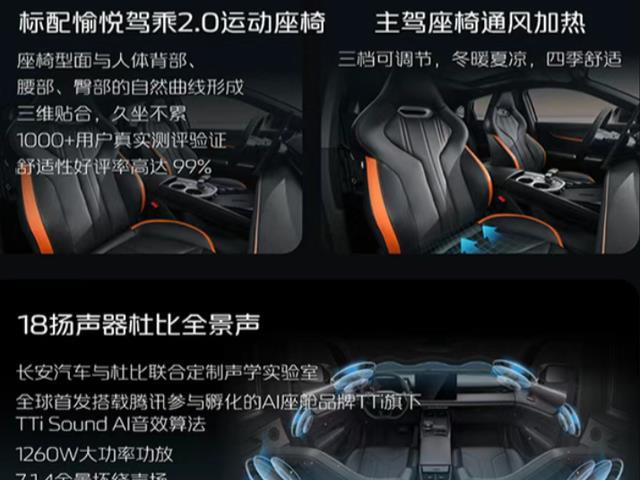 用料方面,黑/橙双色翻毛皮内饰+碳纤维饰板(门板、中控台全覆盖),一体式运动座椅(侧翼加高2cm)带通风/加热/电动调节,长途驾驶也能保持舒适。256色光瀑氛围灯随音乐律动,18扬声器音响系统(带头枕音响)打造移动音乐厅,多车乐团模式支持99台车辆同步灯光与音乐,社交属性拉满。