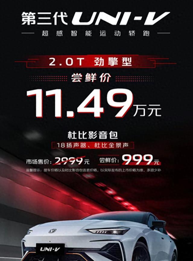 7月15日,长安汽车正式宣布旗下第三代UNI-V开启预售,2.0T劲擎型尝鲜价仅11.49万元,1.5T版本预计10万级起,新车将于8月内正式上市。作为长安UNI系列的明星车型,第三代UNI-V以「未来先锋运动美学」为设计核心,搭载全新蓝鲸3.0动力系统,并首次将电动尾翼、掀背尾门、L2级智驾等配置全系标配,重新定义了10万级运动轿跑的价值标准。
