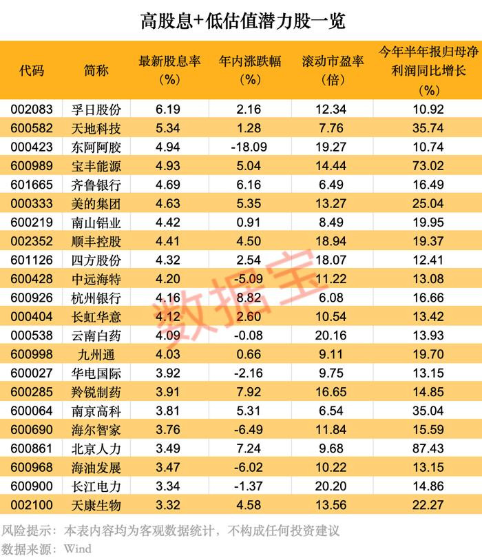 证券时报·数据宝梳理了更具防守能力的高股息低估值潜力股,条件如下:1.以2024年派息计算的最新股息率高于3%;2.滚动市盈率低于25倍;3.年内涨幅低于10%;4.今年上半年及2024年归母净利润均增长超10%。